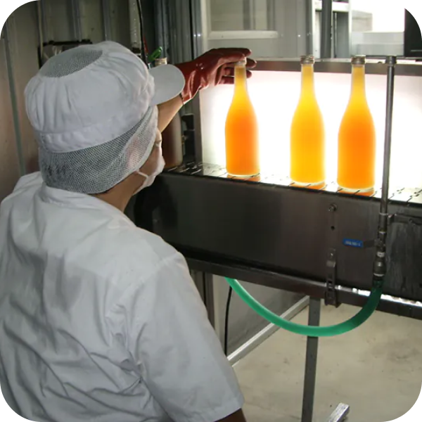 まず瓶は機械でしっかり洗浄され、その後、高温で加熱殺菌したもろみ酢を充填。異物混入がないか1本1本しっかりとチェックしていきます。